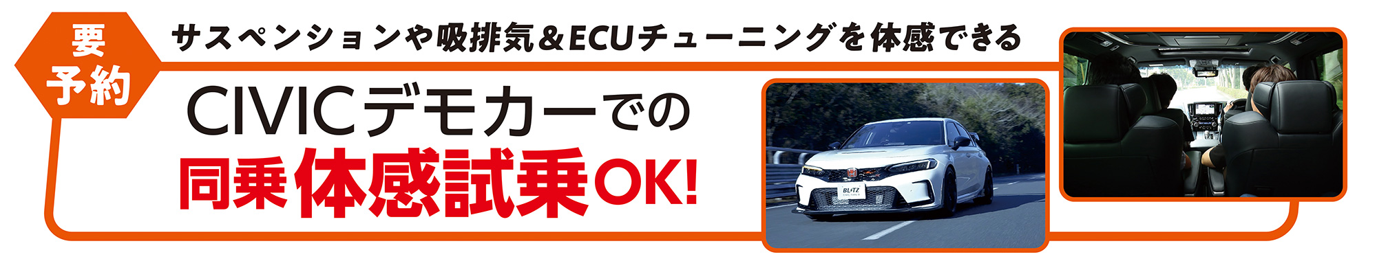 車高調「DAMPER ZZ-R」の試乗に加え、レーザー&レーダー探知機「Touch-LASER」の体感試着などを実施するほか、BLITZ Tuning ECUの即日書換、そしてSFCから生まれたパワコン専用ECUまで、盛りだくさんの内容でシビックオーナー様をお待ちしております!