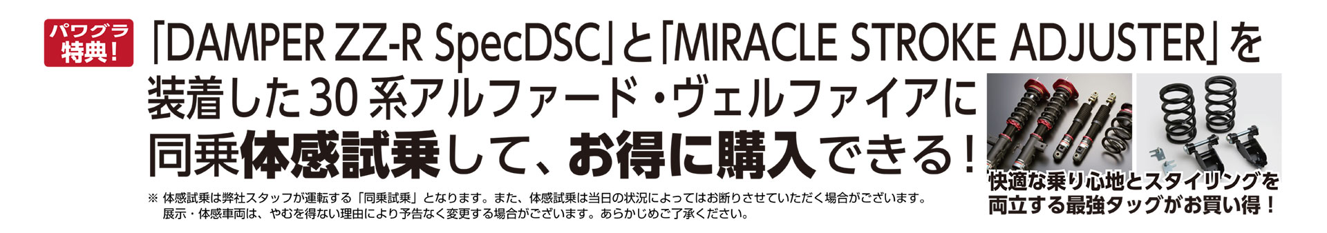 「DAMPER ZZ-R SpecDSC」と「MIRACLE STROKE ADJUSTER」がセットで装着されたデモカーで同乗体感試乗が可能です。