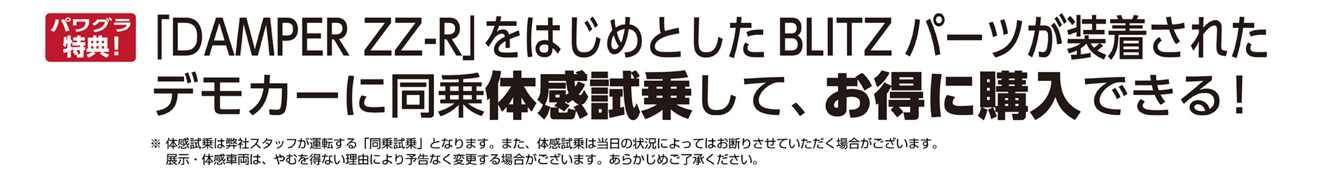 車高調整式サスペンション「DAMPER ZZ-R」シリーズなどが装着されたブリッツデモカーで体感同乗試乗が可能!