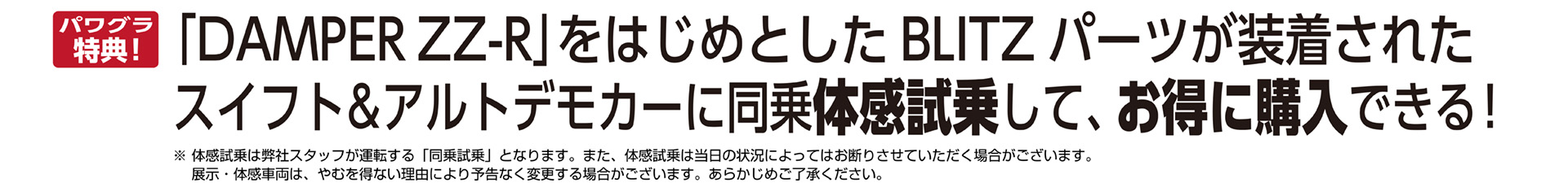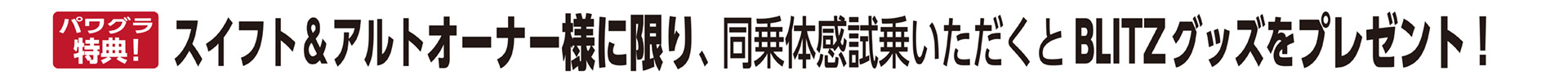 話題のSUZUKI スイフトスポーツ・アルトワークスに特化した、ブリッツの「商品体感型」店頭イベント
