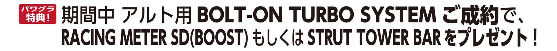 アルトワークスには大幅なパワーアップを実現する「BOLT-ON TURBO SYSTEM」が装着されていますので、ぜひこの機会に体感の上ご検討ください。