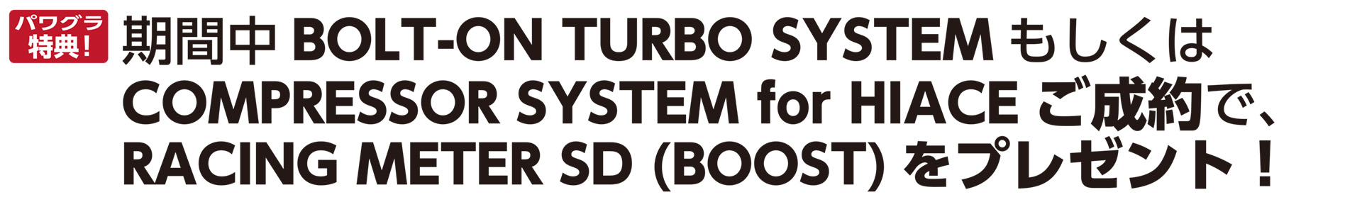 そして「BOLT-ON TURBO SYSTEM」や「HIACE COMPRESSOR SYSTEM」のご成約特典もご用意しています。