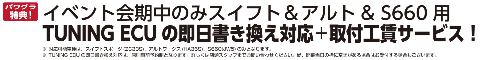 ※対応可能車種は、スイフトスポーツ(ZC33S)・アルトワークス(HA36S)・S660(JW5)のみとなります。