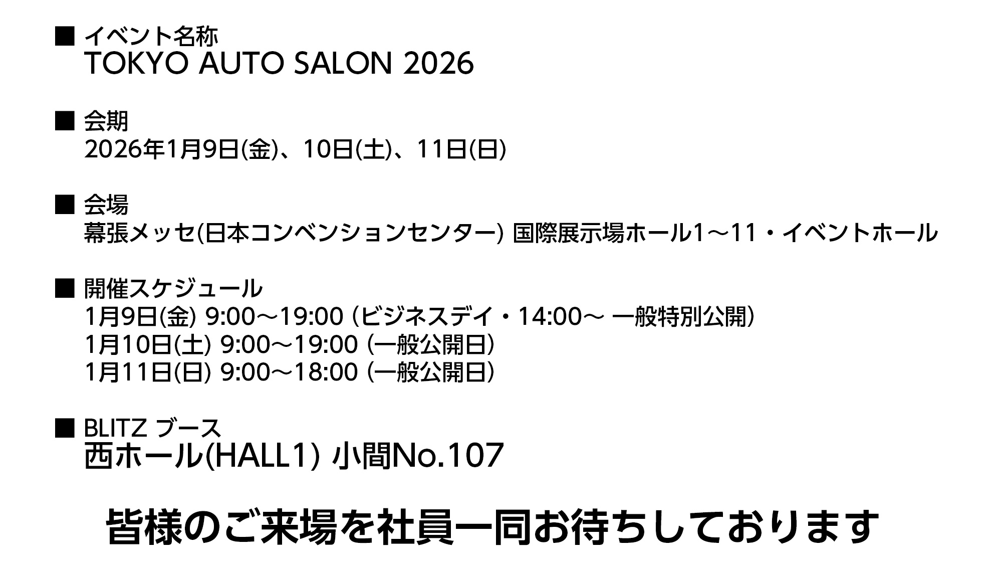株式会社ブリッツは、2026年1月9日(金)から11日(日)の3日間、幕張メッセ国際展示場ホール(千葉県)で開催される、「TOKYO AUTO SALON 2026」へ出展いたします。