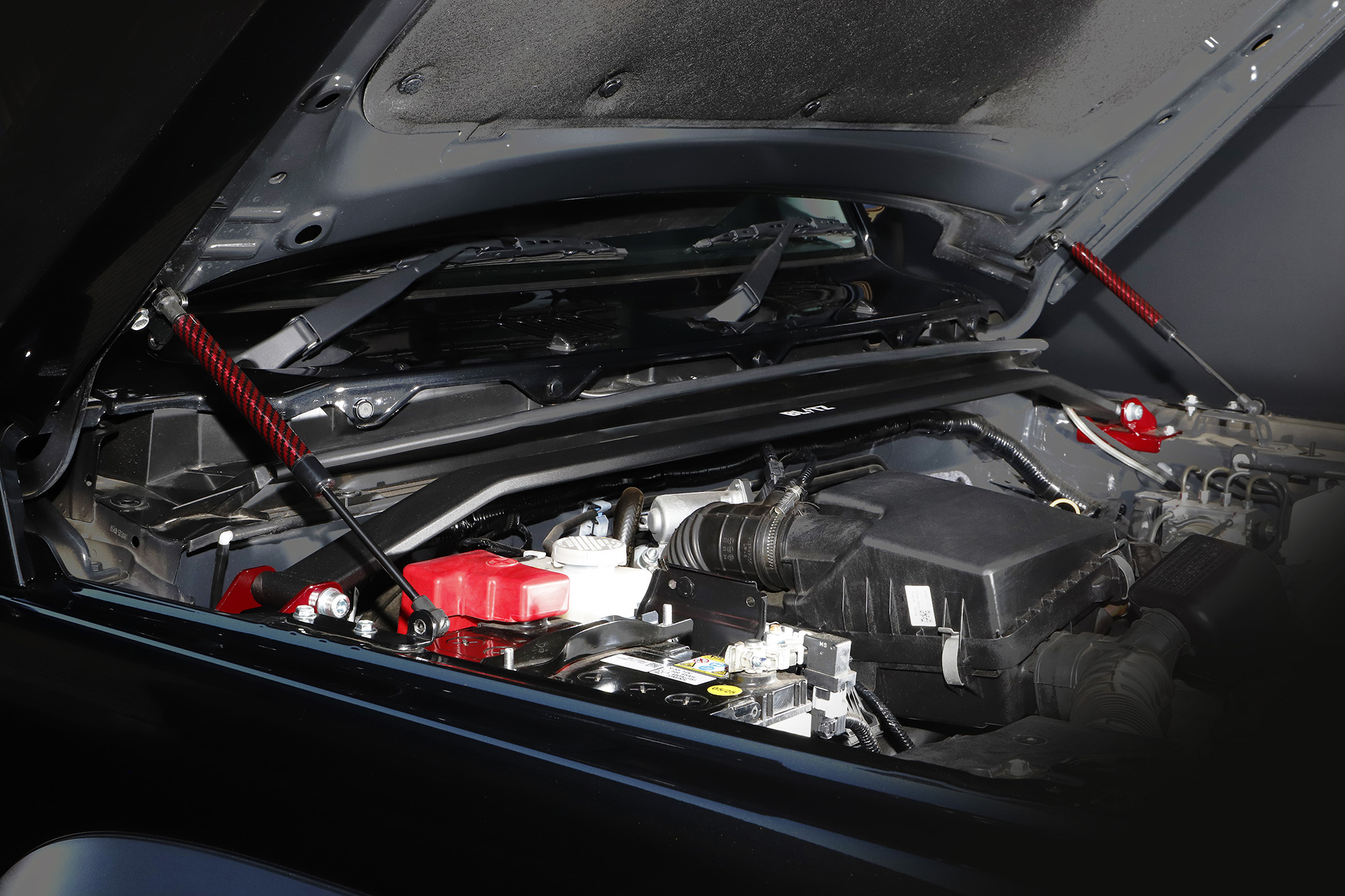 - レッドカーボンがエンジンルームのドレスアップに貢献。