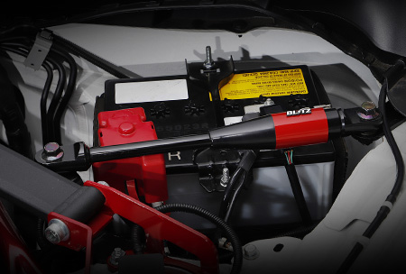 ストラットタワーバー- ボディの歪みを抑制し、サスペンション性能をフルに発揮させるアルミ製ストラットタワーバー。