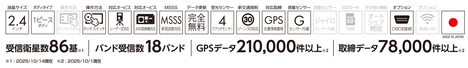 新たに稼働が確認されている、ステルス型取締機「JMA-600(NTG-962)」をはじめ、導入が進む最新の移動式オービス「JMA-520」と「JMA-401」(レーダー式取締機搭載パトカー)への警報にも対応。