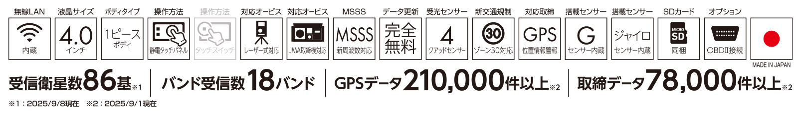 新たに稼働が確認されている、ステルス型取締機「JMA-600(NTG-962)」をはじめ、導入が進む最新の移動式オービス「JMA-520」と「JMA-401」(レーダー式取締機搭載パトカー)への警報にも対応。